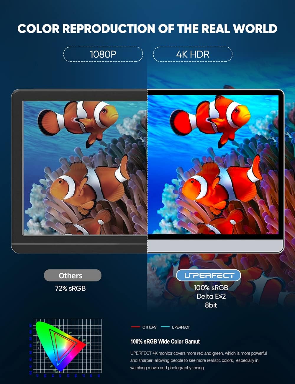 ✅【4K HDR GAMING MONITOR】AZMIOR 4K UHD portable monitor adopts a 3840 x 2160 IPS A-grade screen, provide you a vivid image, clear motion and details, four times for FHD portable gaming monitor. Build-in AMD FreeSync, 3MS response time and HDR for immersive gaming experience, 60Hz refresh rate. 300cd/㎡, 1000:1 Contrast Ratio, 100% sRGB color gamut, 16.7M colors, 178°viewing angle. Low Blue Eye Care tech minimizes blue light to reduce eye strain.