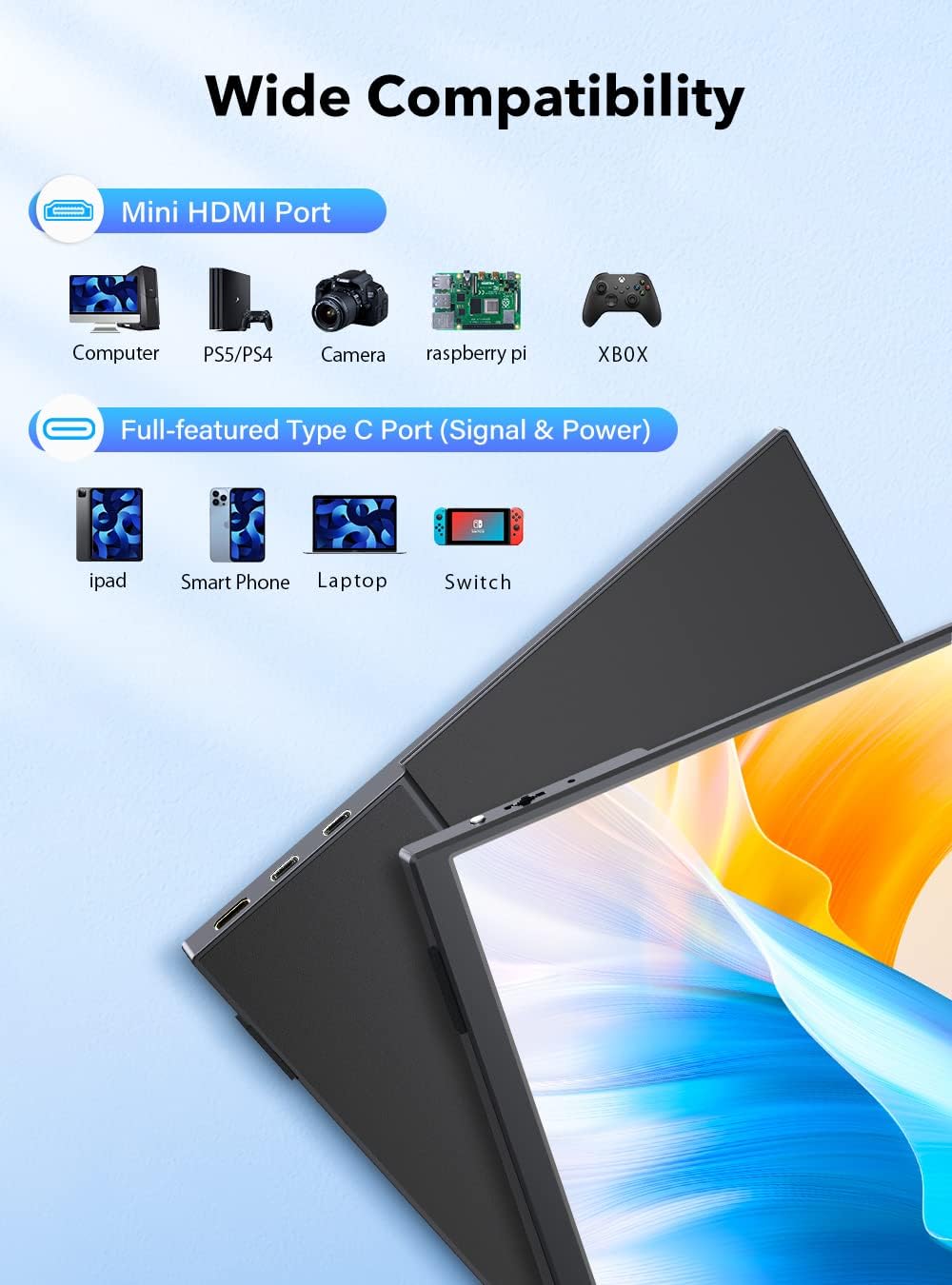 【Wide Compatibility & Plug and Play】 Unlike other portable monitors, our portable touchscreen monitor is upgraded with 2 full-function Type-C ports and Mini HDMI port, no need app, driver, just plug and play, widely compatible with laptops, PCS, phones, gaming consoles, PS4, PS5, XBOX, Nintendo Switch, Raspberry Pi, etc.